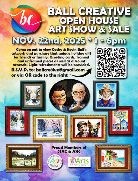 Come on out to view Cathy & Kevin Ball's artwork and purchase that unique holiday gift for friends or family. Greeting cards, framed and unframed pieces as well as discounted artwork. Light refreshments will be provided.