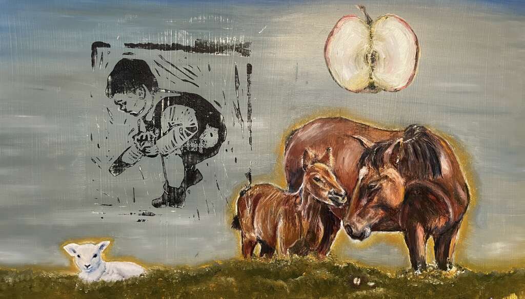 This artwork is a mixed-media piece that explores ideas of youth, nature, and innocence. I often use nature motifs in my paintings as I am inspired by the green spaces of Alliston and surrounding areas. I often do my artwork outside in the warmer months, and use the outdoors to inform my art-making. I used both oil painting and block printing in this piece, layering different mediums on top of one another to capture what a memory looks like in my mind's eye. I aimed to represent the absurdity and haziness of childhood memories.