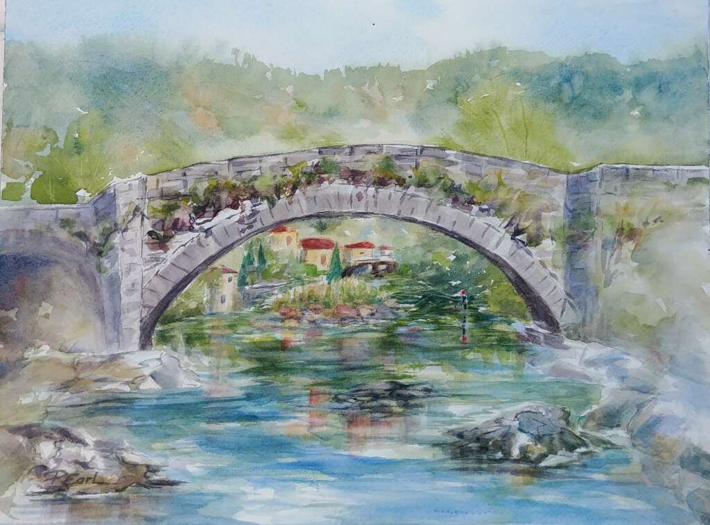 "The Fisherman, Southern France" painted onsite during a recent trip to southern France, this original watercolor captures the timeless charm of a stone bridge arching over a tranquil river. A fisherman is seen casting his line in the river, mostly hidden from view by passerbys. Delicate washes of greens, blues, and warm earth tones evoke the natural beauty and calm of the French countryside. The scene draws you into the peaceful ambiance of a quiet village nestled among rolling hills, with soft reflections dancing in the water below.