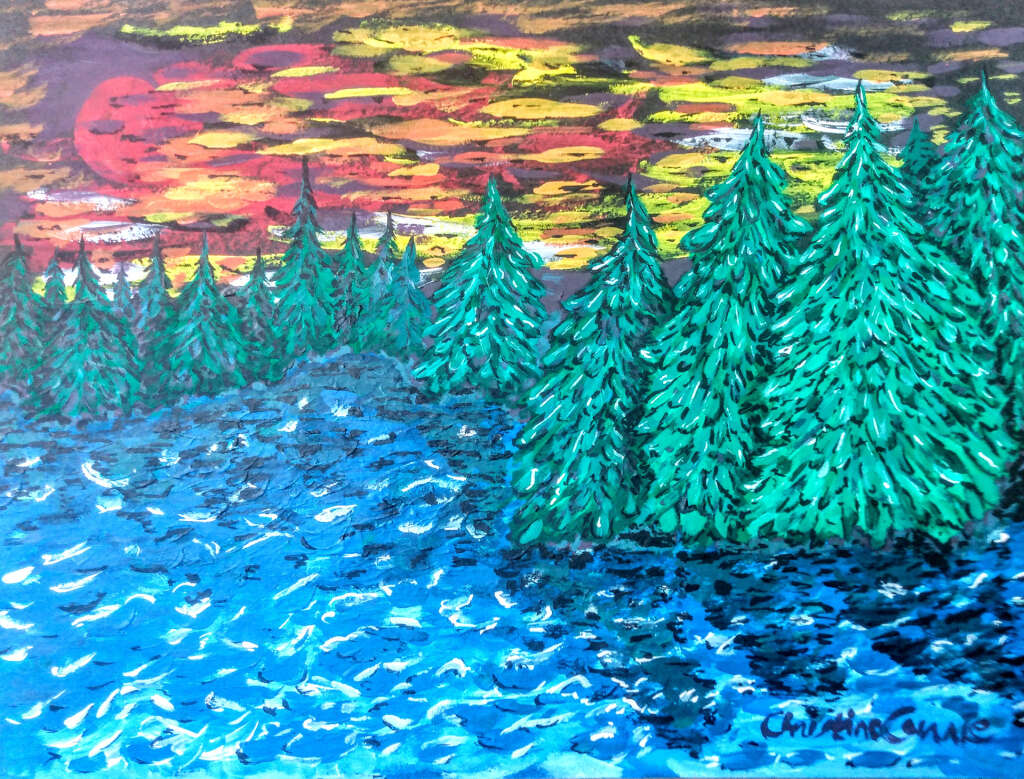 Moody landscape painting inspired by time spent near Huntsville, Ontario.Professional-grade gouache on acid-free black paper. Artwork measures 12"Wx9"H. Framed size with mat 14"Wx11"H.