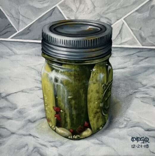 The painting shows pickles packed into a clear glass jar on a table, their green shapes pressed together and slightly distorted by the curved glass.