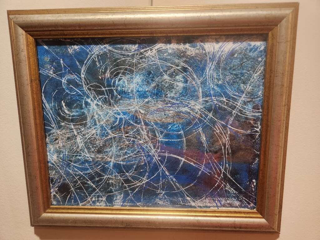 This monoprint merges deep blacks and shifting blues with a foreground of white and silver lines that trace their way across the surface like a memory map. The marks suggest a place shaped by movement—perhaps the looping paths of driver training, or the glistening arcs of skate blades carving across an ice rink.
