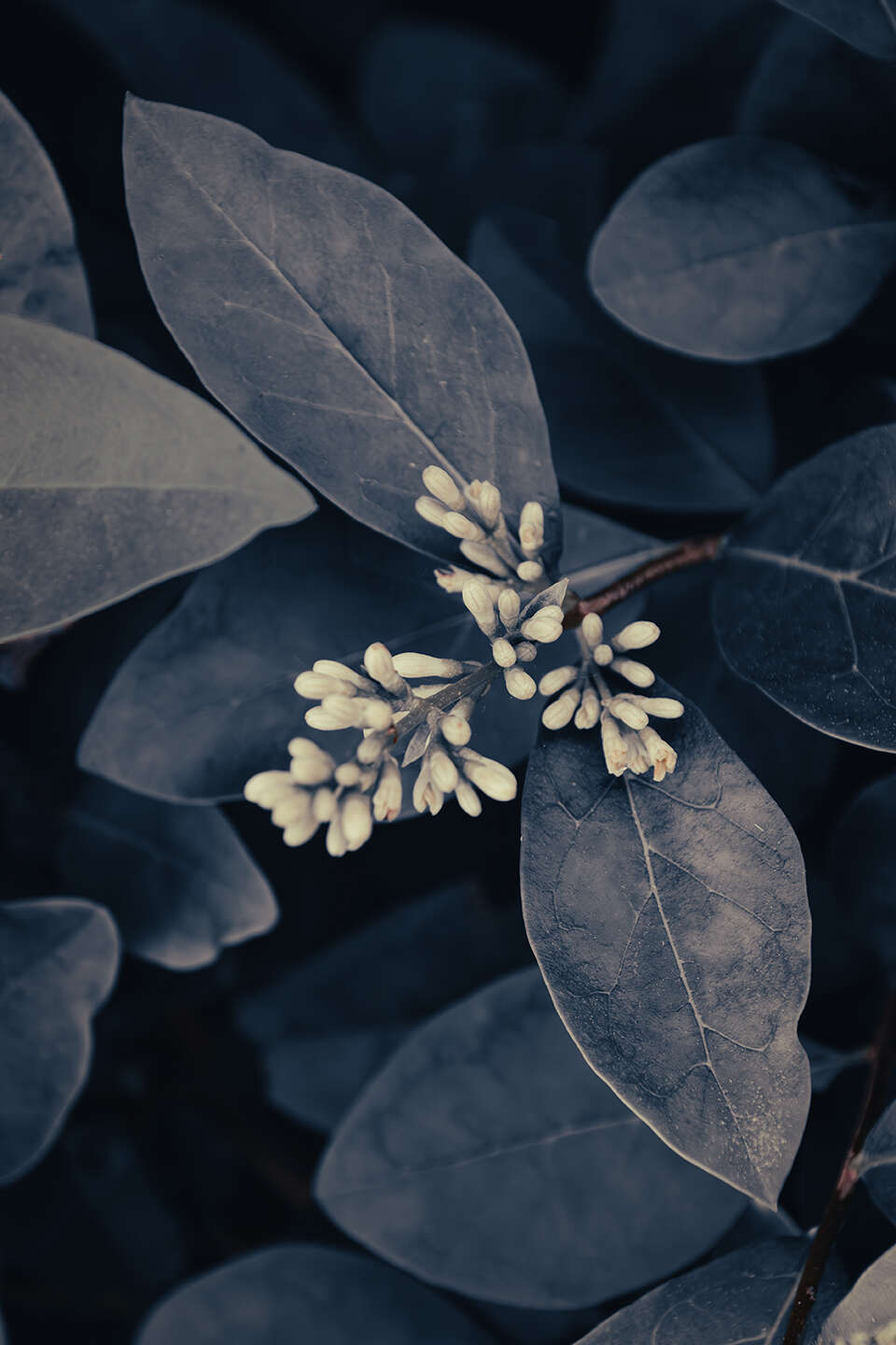 A delicately tinted close up of a plant with white buds about to flower, hinting at the promise hidden within.