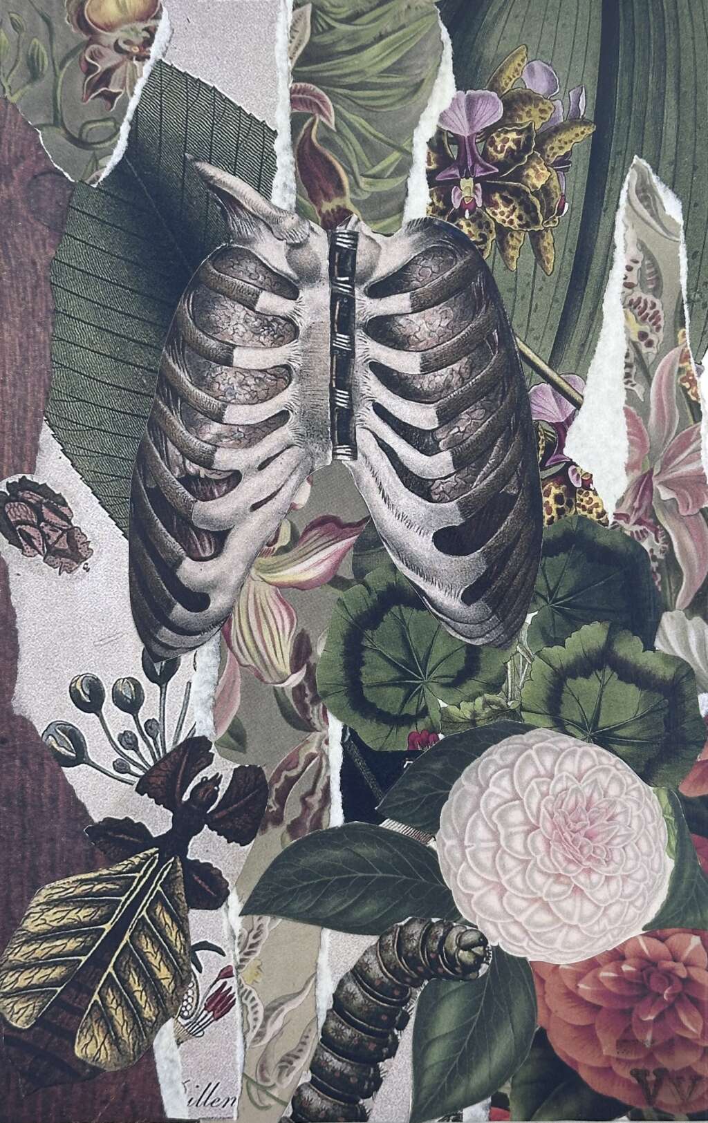 This Paper Collage is created by South Simcoe Arts Council member artist, Vanessa Valenzuela. Nature serves as her muse, as she skillfully portrays its raw beauty and the fragile balance between humanity and the natural world. Vanessa fearlessly delves into the enigmatic realm of death, contemplating its mysteries and provoking introspection through her thought-provoking artworks. This Paper Collage is framed under glass. Framed size is 11" x 14".